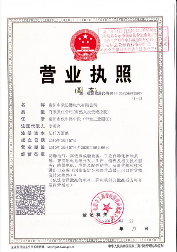 南陽中榮防爆電氣有限公司 版權所有 Copyright @2019-2022 豫ICP備19025585號-2 營業(yè)執(zhí)照